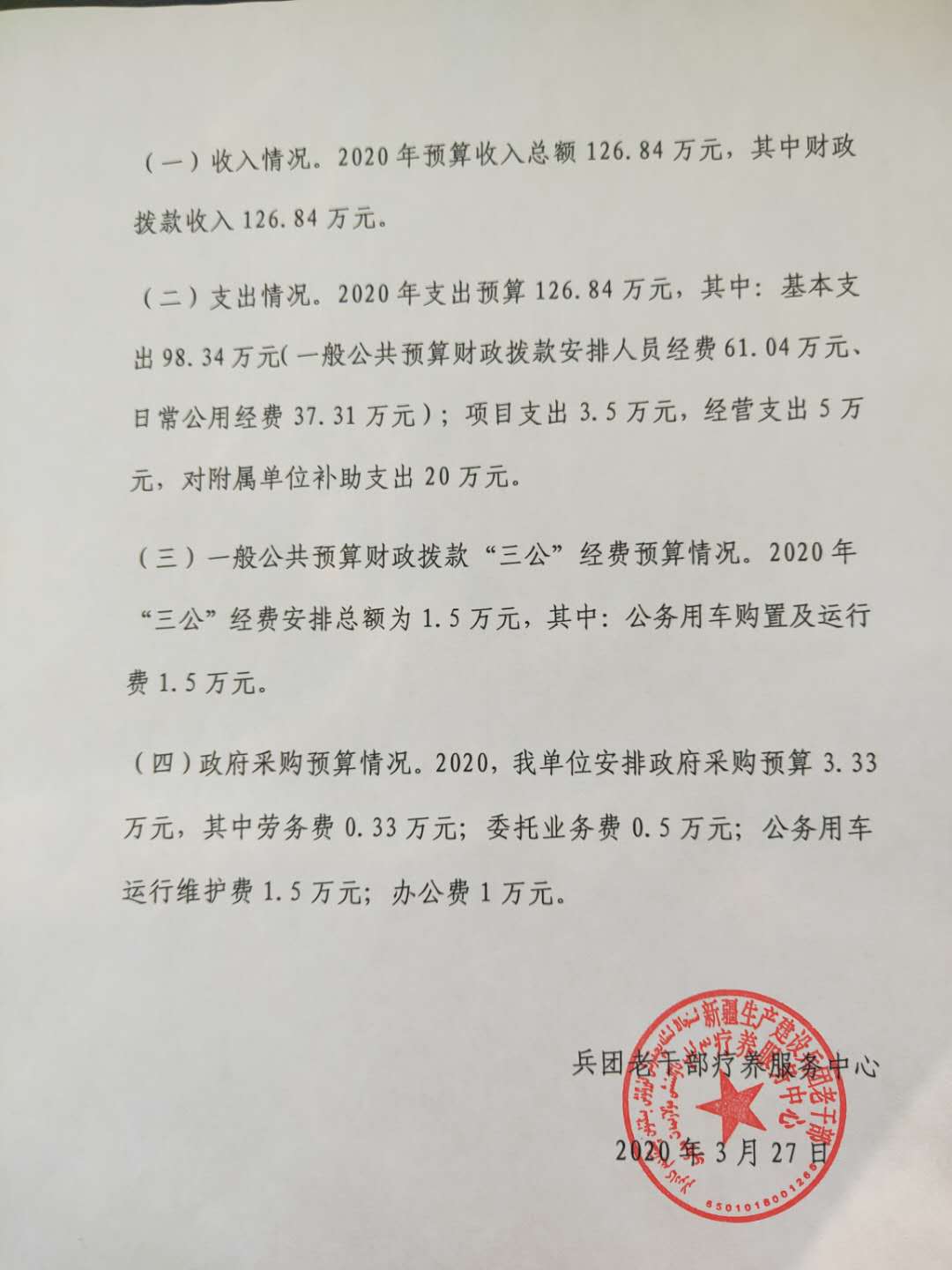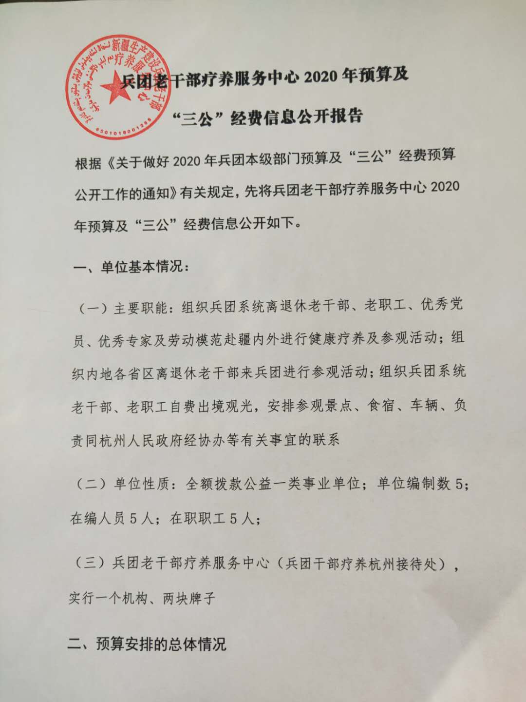根据《关于做好2020年兵团本级部门预算及“三公”经费预算公开工作的通知》有关规定,先将兵团老干部疗养服务中心2020年预算及“三公”经费信息公开如下。
